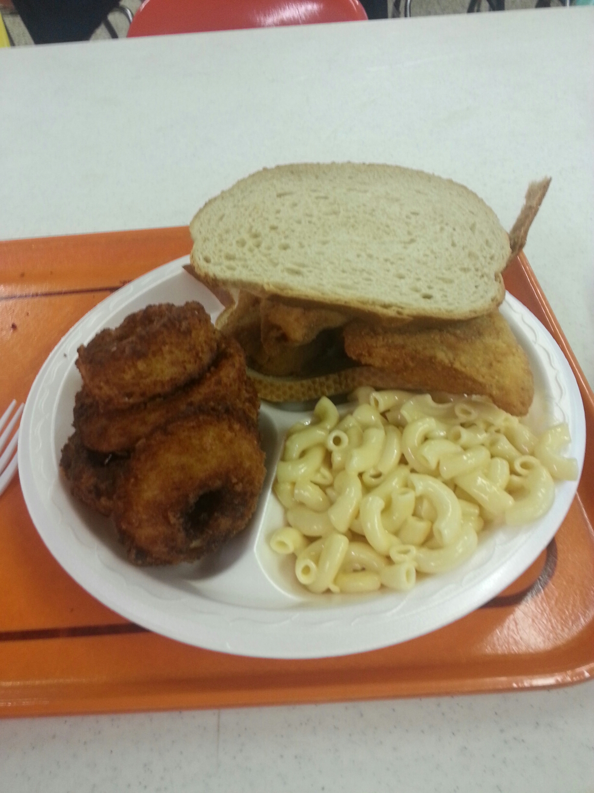 While fish was the main offering, they were also selling vegetarian gumbo.  I stuck with the usual: fish on rye with a side of macaroni and cheese (which, oddly enough, is served more often in the South than up north) and onion rings.